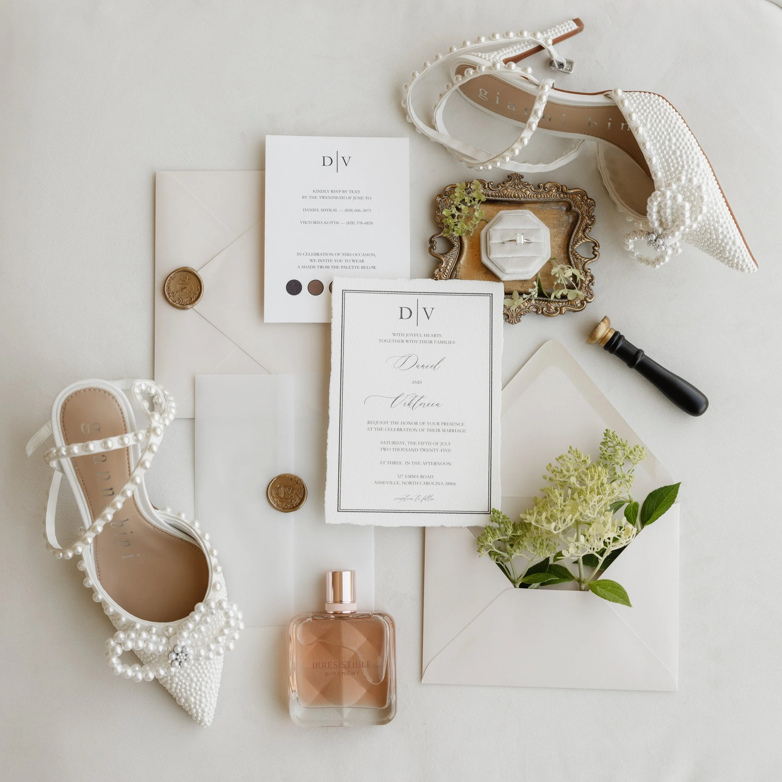 Your keepsake suite is a curated, fully styled version of your invitations, arranged with hand-selected details and placed in an heirloom linen box. Created for day-of photography and meant to be displayed and cherished for years to come.