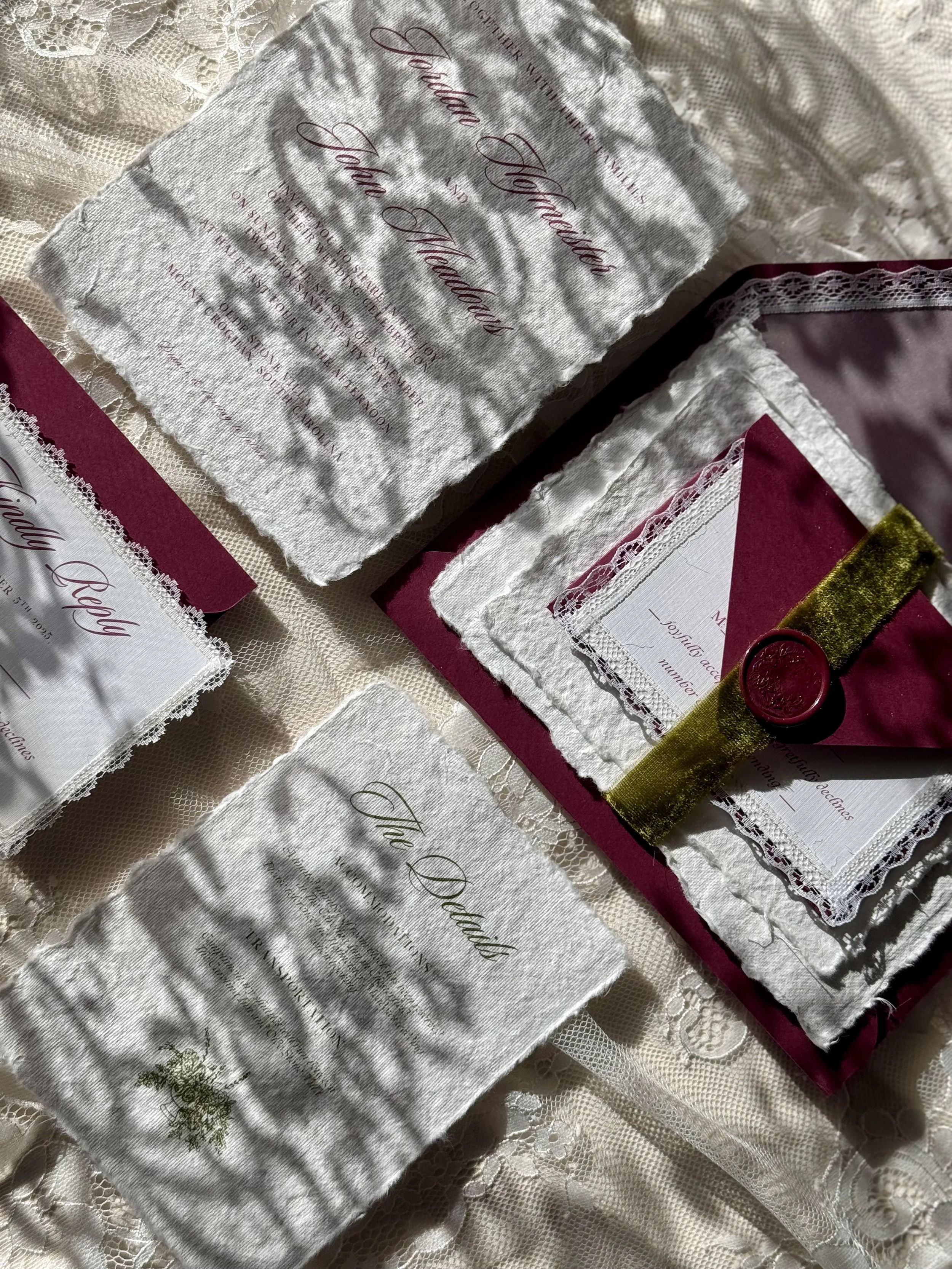 After booking, you’ll receive a curated sample box filled with our favorite papers, envelope colors, print methods, and ribbons. It’s the perfect way to experience the textures and finishes that make your suite feel truly special.